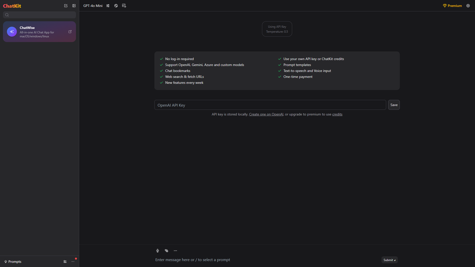 ChatKit — это десктопное приложение «всё-в-одном» для работы с ИИ-чатами на macOS, Windows и Linux. Оно предлагает улучшенный интерфейс для ChatGPT-подобных моделей и позволяет использовать собственный API-ключ или кредиты ChatKit без обязательной регистрации.