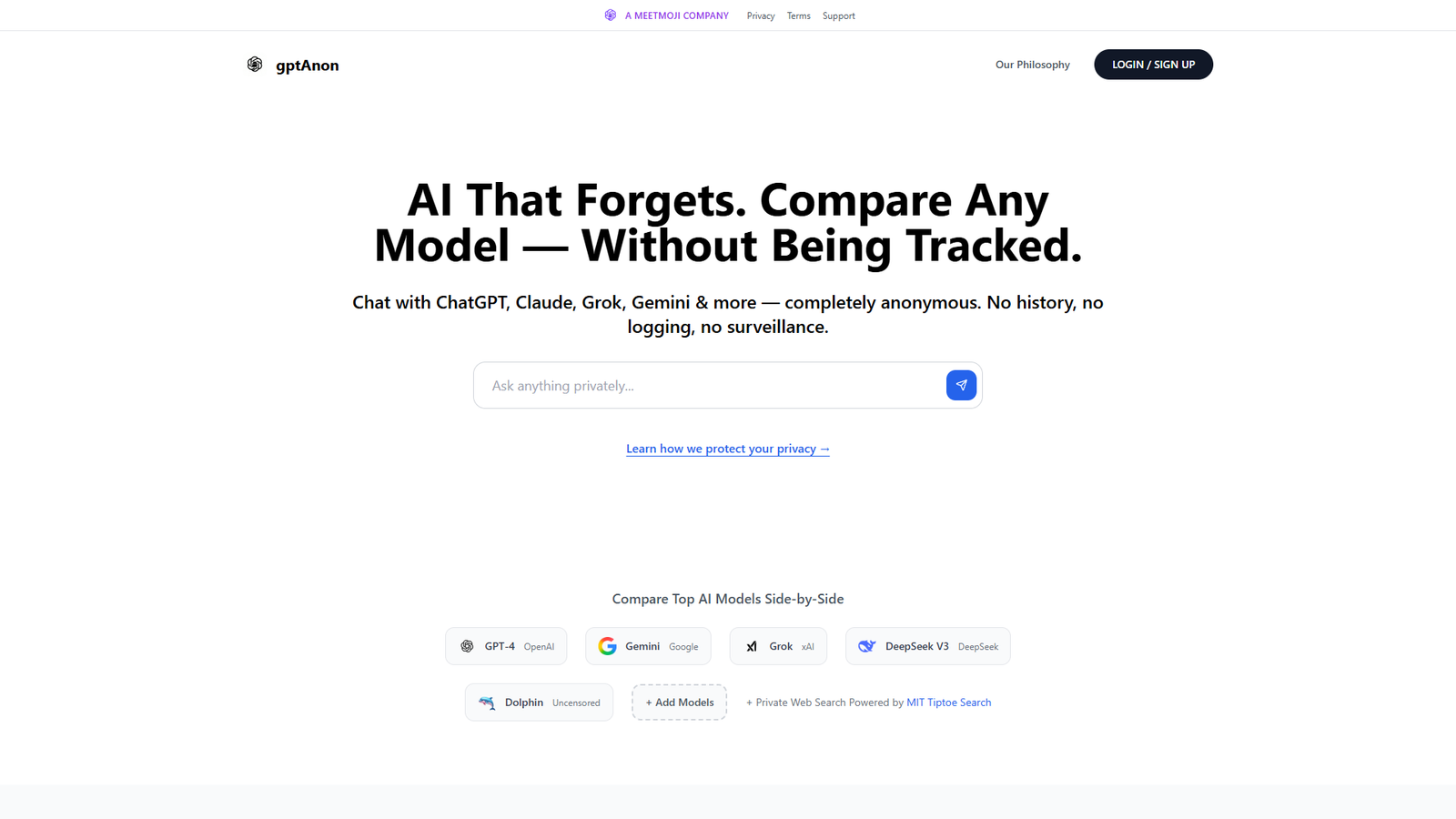 GPTAnon — анонимный чат с ИИ и инструмент для сравнения разных моделей в одном окне. Пользователь общается с ChatGPT, Claude, Grok, Gemini и десятками других моделей, не оставляя следов на сервере.