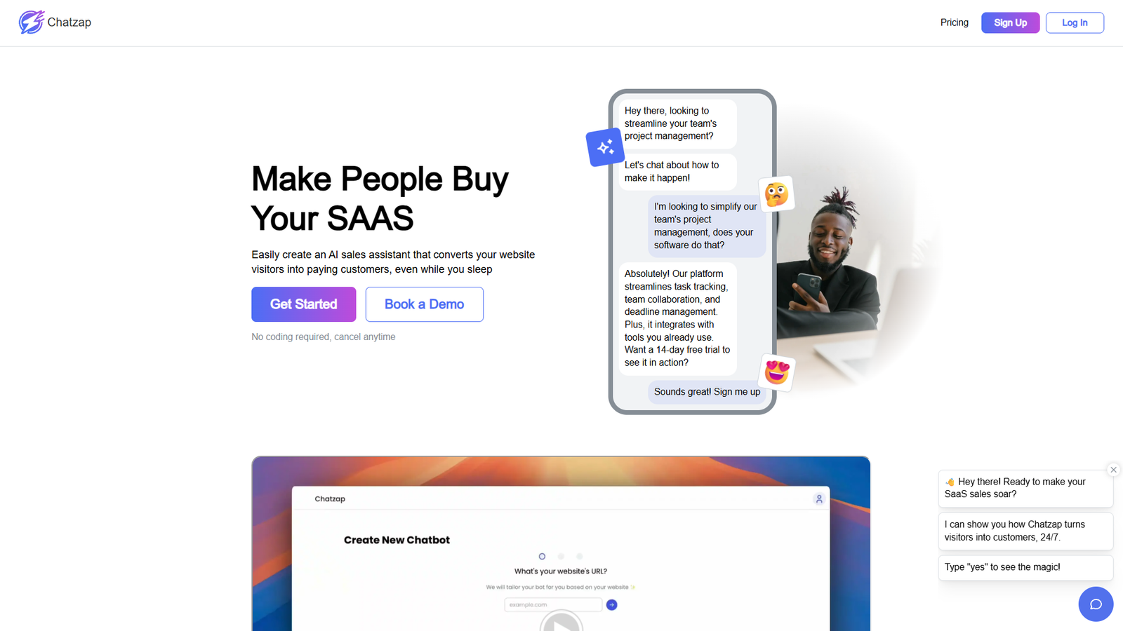 Chatzap — это AI-продажник для вашего SaaS, который превращает посетителей сайта в платящих клиентов в режиме 24/7. Сервис помогает автоматически квалифицировать лиды, отвечать на вопросы и подталкивать пользователя к регистрации, демо или оплате.