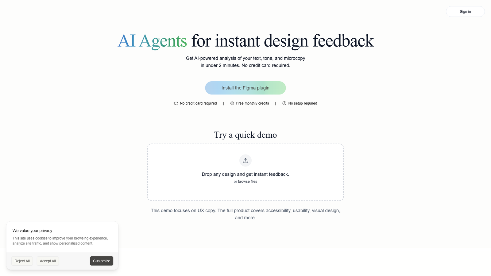 Для начала работы достаточно установить плагин Figma или загрузить дизайн через веб-интерфейс. Доступен демо-режим, где можно проверить, как AI оценивает UX-копирайтинг и другие аспекты макета, прежде чем подключать инструмент к рабочему процессу команды.