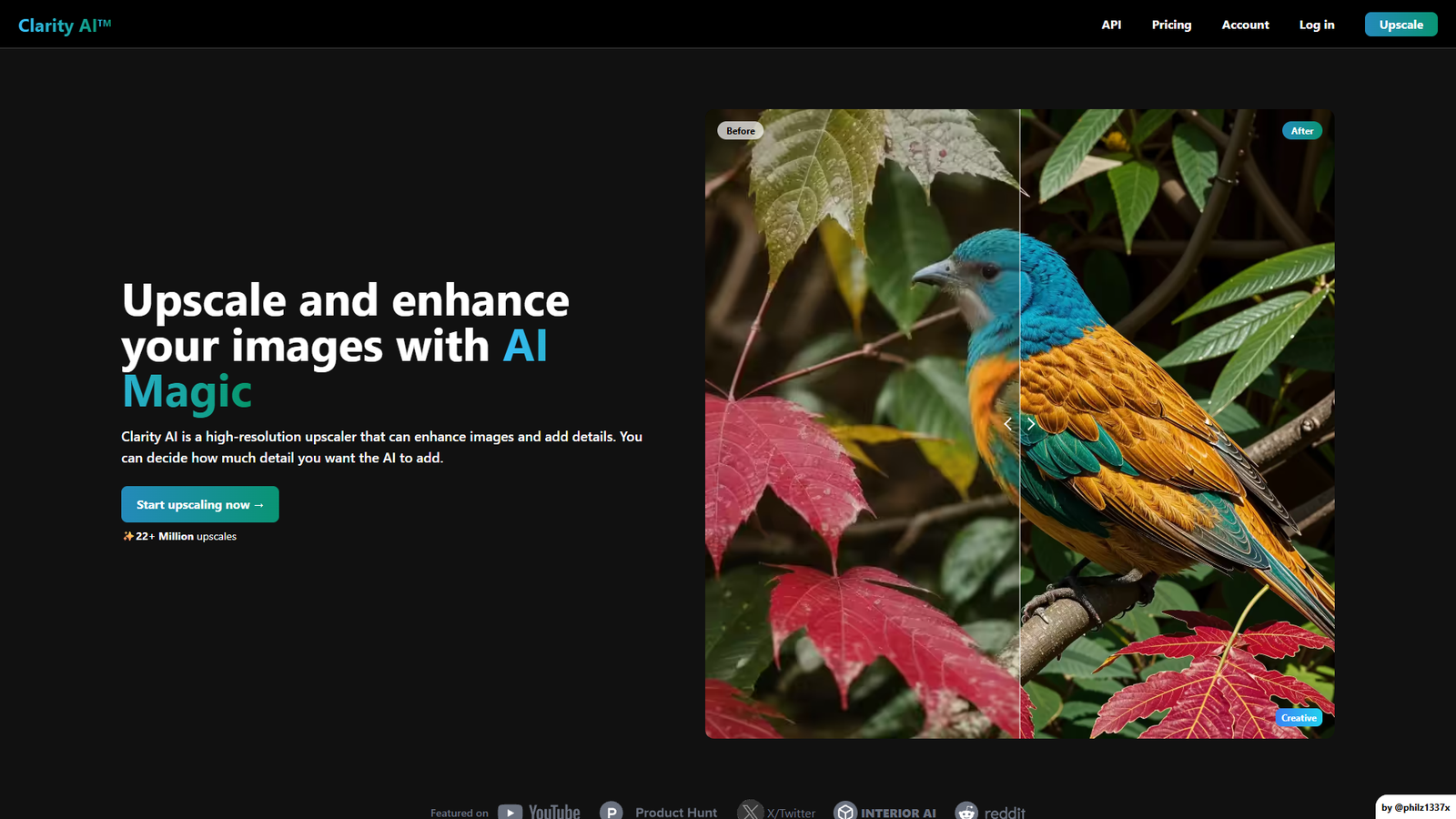 Clarity AI — нейросеть для апскейла и улучшения изображений с упором на максимальное разрешение и контроль над деталями. Инструмент подходит для фотографов, дизайнеров, создателей контента и всех, кому важно вытянуть максимум качества из исходной картинки.