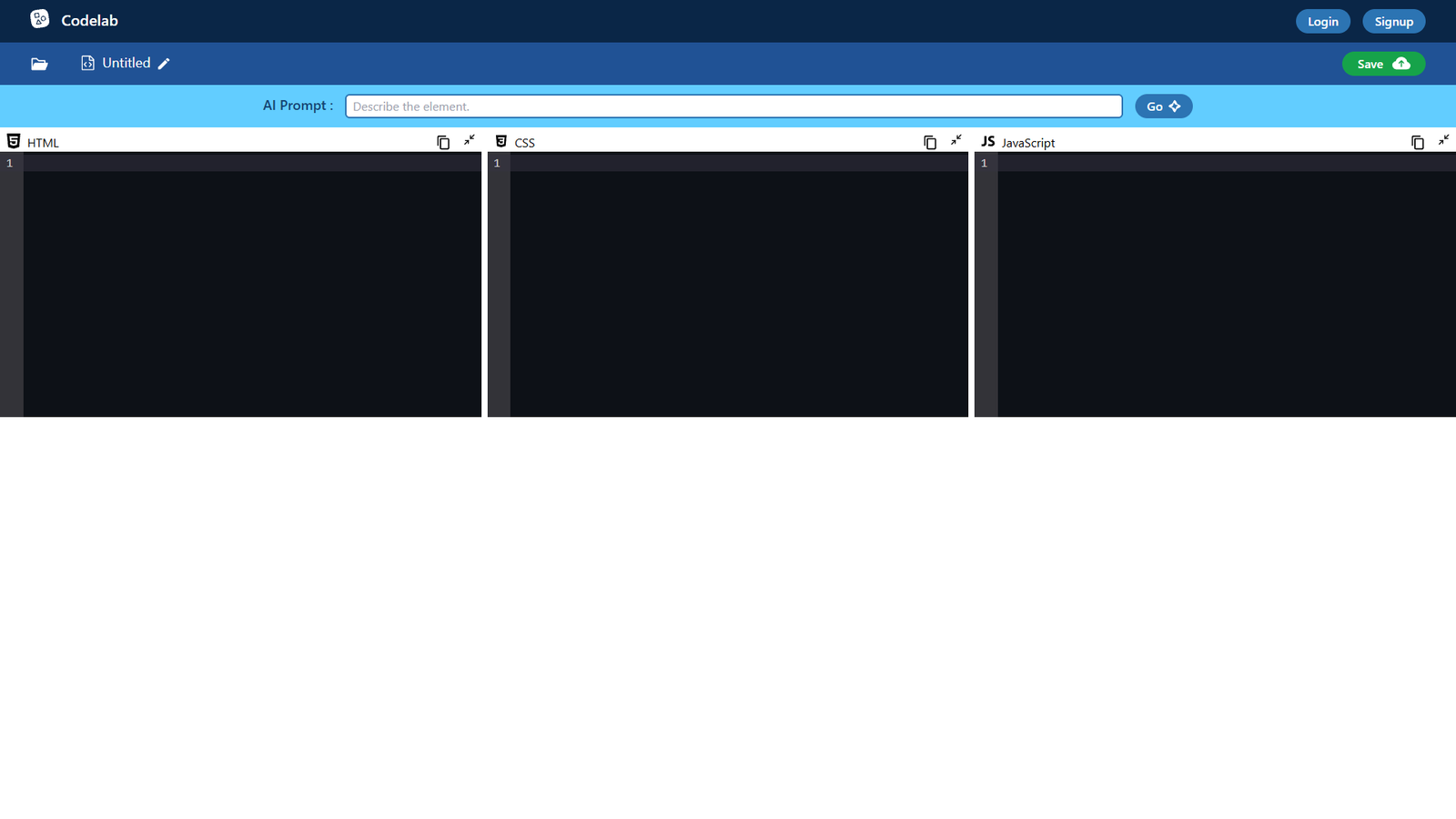 Codelab — это онлайн-песочница для работы с кодом и AI-подсказками, где вы можете экспериментировать с HTML, CSS и JavaScript в одном месте. Интерфейс напоминает классический онлайн-редактор кода, но дополняется возможностью использовать AI Prompt для ускорения разработки и генерации решений.
