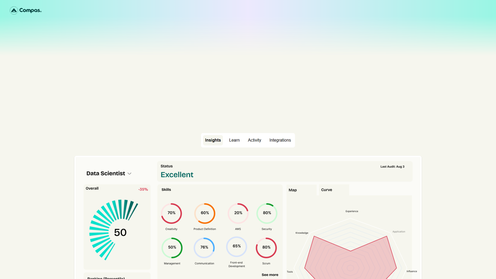 CompasAI — это ИИ-ассистент для развития навыков и планирования карьеры, который собирает данные из рабочих инструментов и превращает их в понятную картину компетенций. Пользователь подключает свои приложения — от таск-трекеров до средств коммуникации — и получает объективный срез того, какие навыки уже развиты, а где есть пробелы.