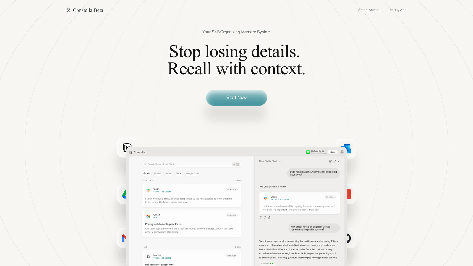 Constella подключается к Notion, Slack, Gmail, Google Drive, Календарю и приложениям задач. Данные из этих источников объединяются в единую систему, где их можно искать, просматривать по контексту и быстро вспоминать нужные детали.