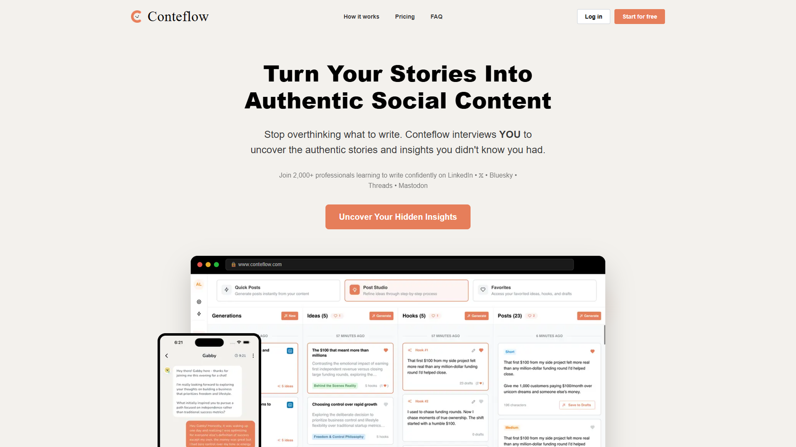 У Conteflow есть мобильное приложение для iOS и Android, чтобы вы могли быстро фиксировать мысли и истории на ходу. Позже сервис поможет превратить эти заметки в готовые посты, сохраняя ваш голос и стиль.