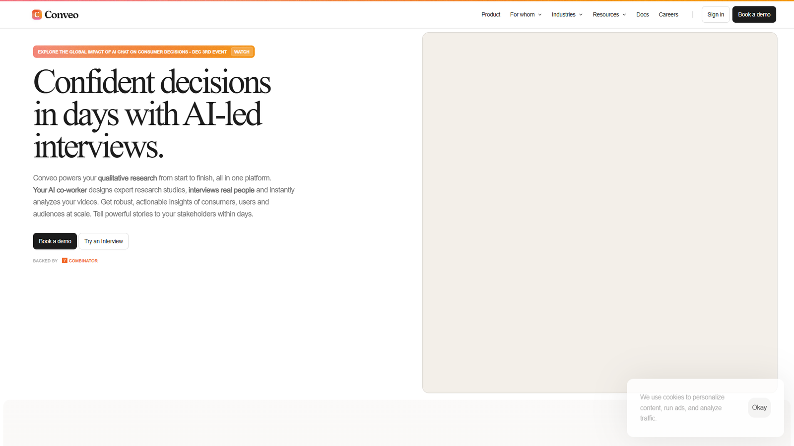 Conveo — инструмент для качественных исследований, где ключевую работу берёт на себя ИИ-собеседник. Он проводит структурированные интервью с реальными людьми, фиксирует нюансы речи и сразу переводит разговоры в данные для анализа.