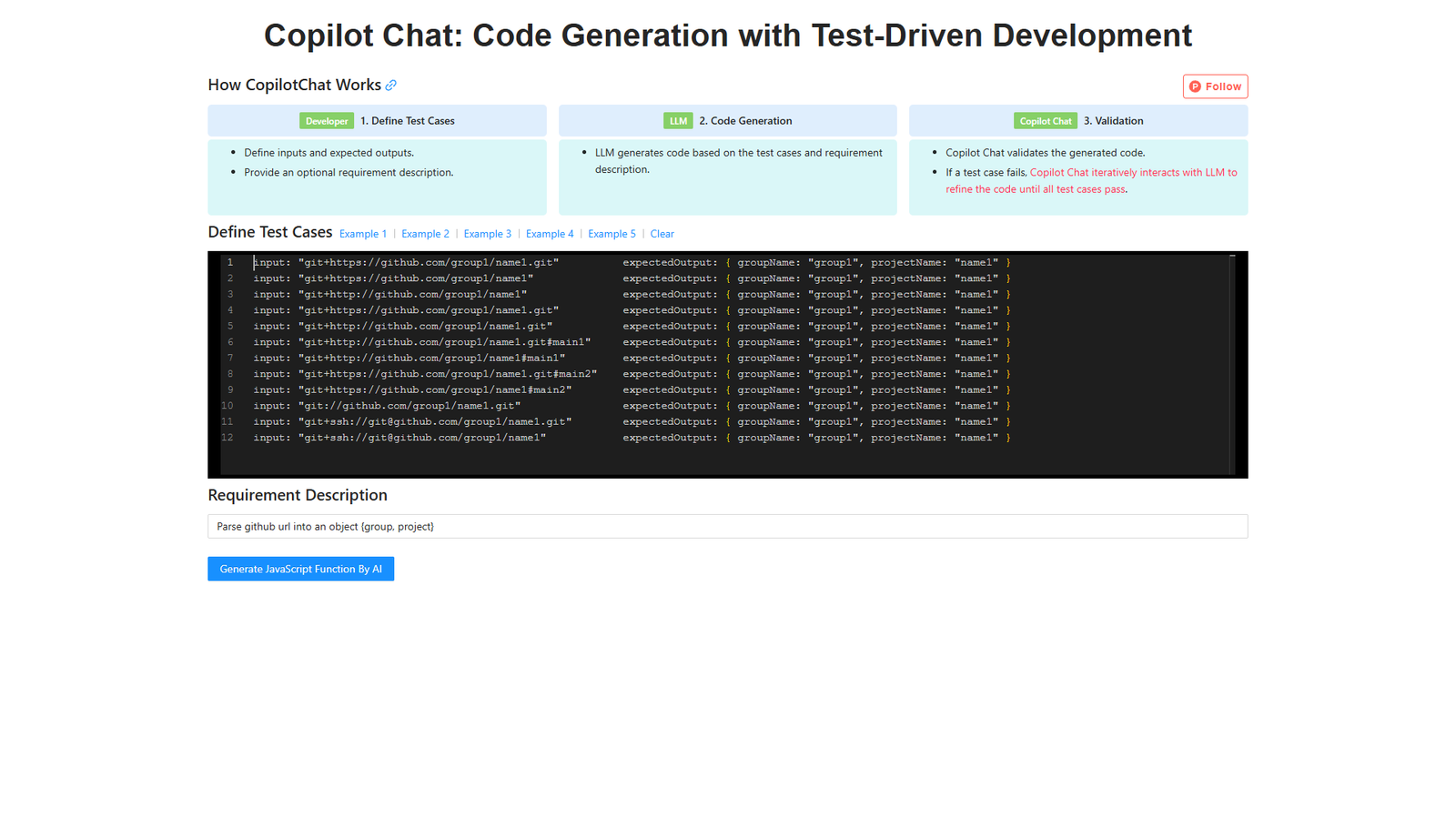 Copilot Chat автоматизирует генерацию кода по принципам разработки через тестирование (TDD). Разработчик сначала задает тест-кейсы: входные данные, ожидаемые результаты и при необходимости краткое текстовое описание требований.