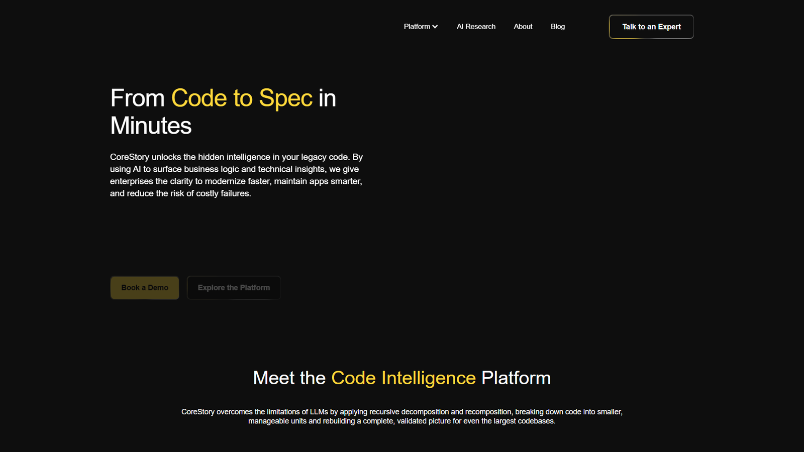 CoreStory — система «интеллекта кода» для крупных корпоративных проектов. Она анализирует обширные и устаревшие кодовые базы, извлекает из них бизнес-логику и технические зависимости и превращает разрозненный код в понятные спецификации.