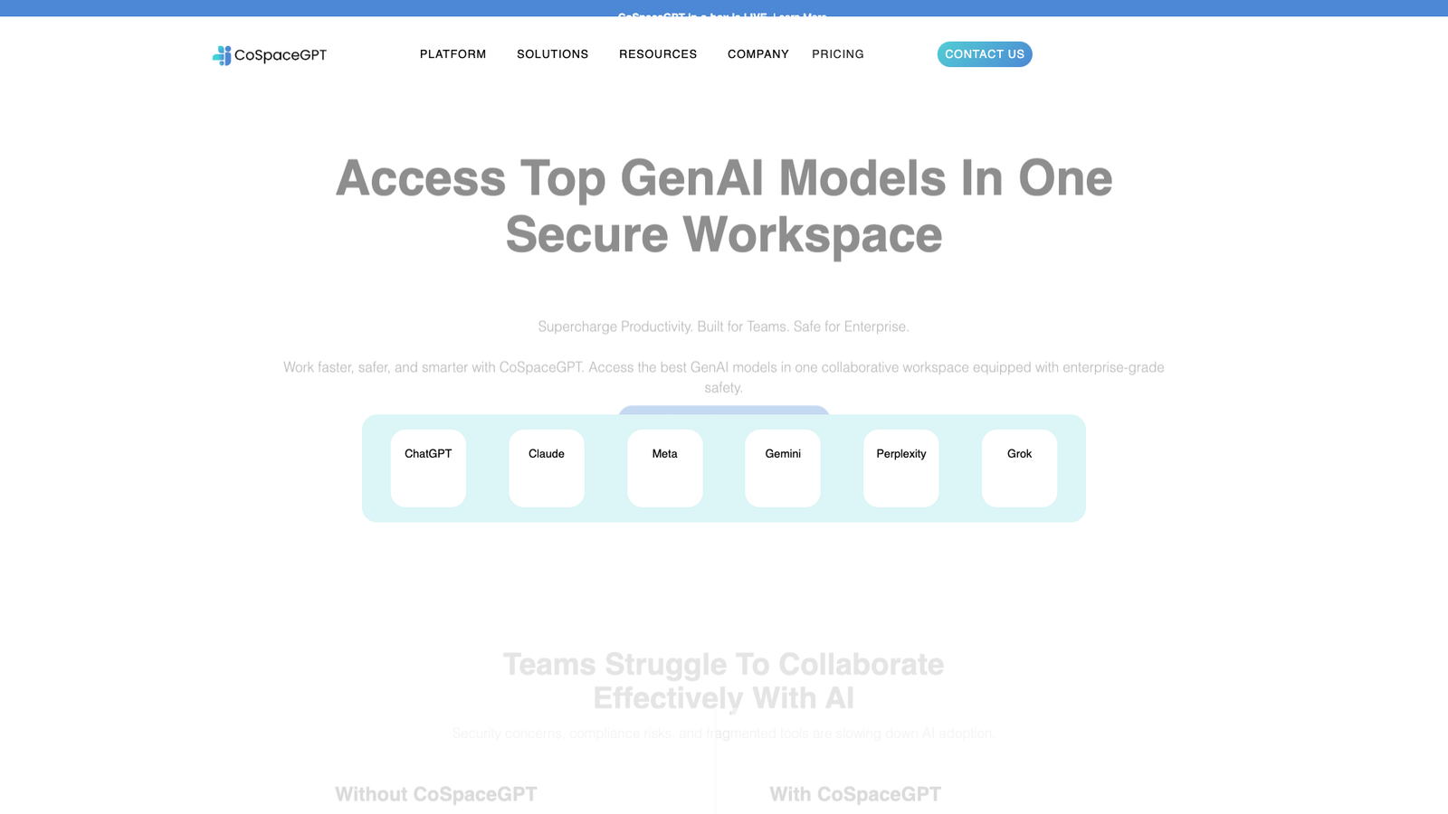 CoSpaceGPT объединяет несколько ведущих языковых моделей в одном защищённом рабочем пространстве. В одном интерфейсе доступны ChatGPT, Claude, модели Meta, Gemini, Perplexity, Grok и другие крупные LLM, что упрощает сравнение ответов и выбор оптимального инструмента под задачу.
