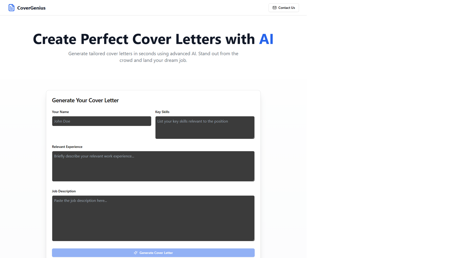 Cover Genius — онлайн‑сервис на базе ИИ для быстрой генерации идеальных сопроводительных писем под любую вакансию. Он помогает соискателям выделиться среди конкурентов и повысить шансы получить приглашение на собеседование.