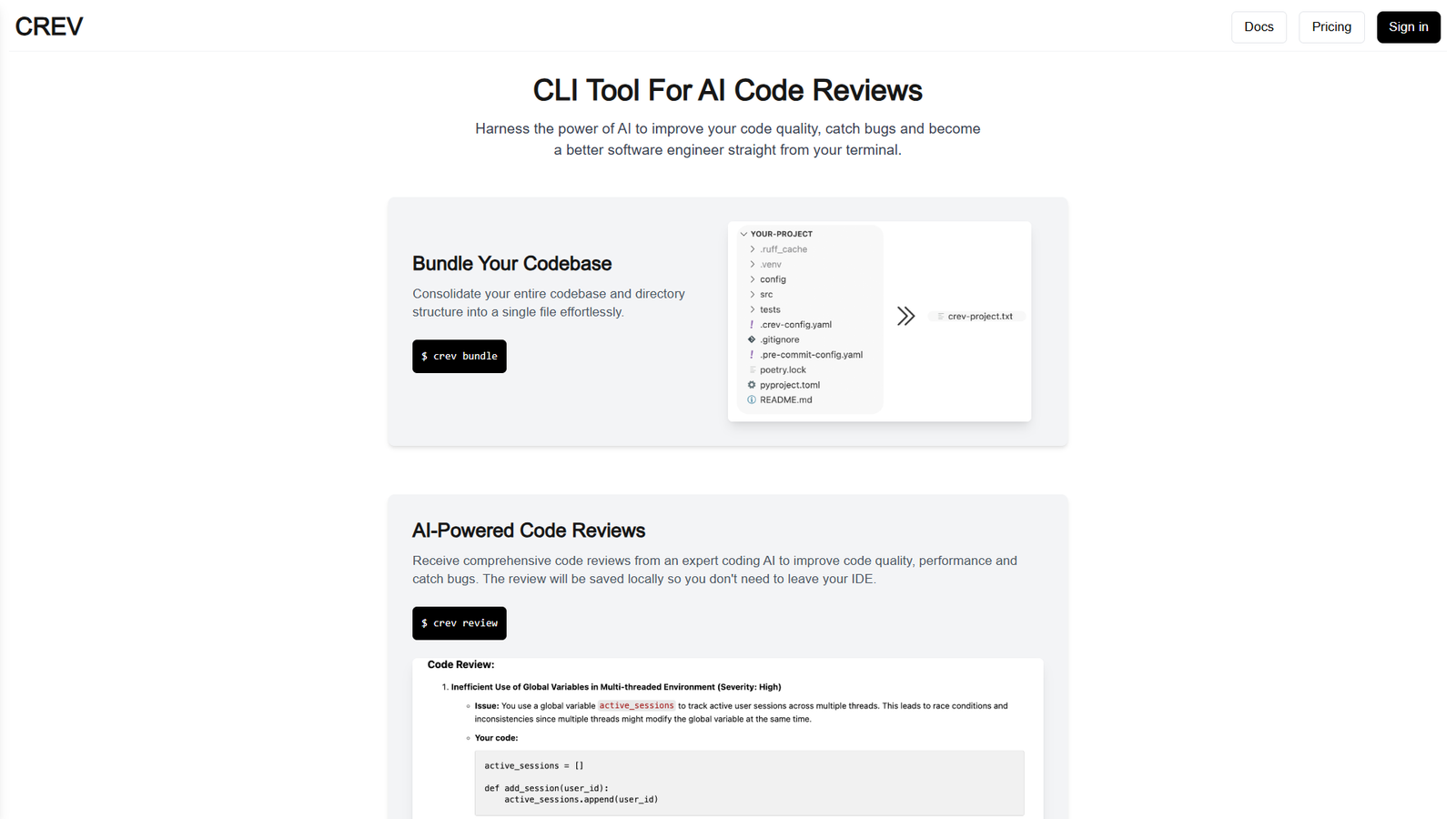Crev позволяет упаковать весь проект и структуру директорий в один файл с помощью простой команды crev bundle. Затем вы можете запустить crev review, чтобы получить детальный разбор кода от специализированного AI, ориентированного на качество, производительность и поиск ошибок.