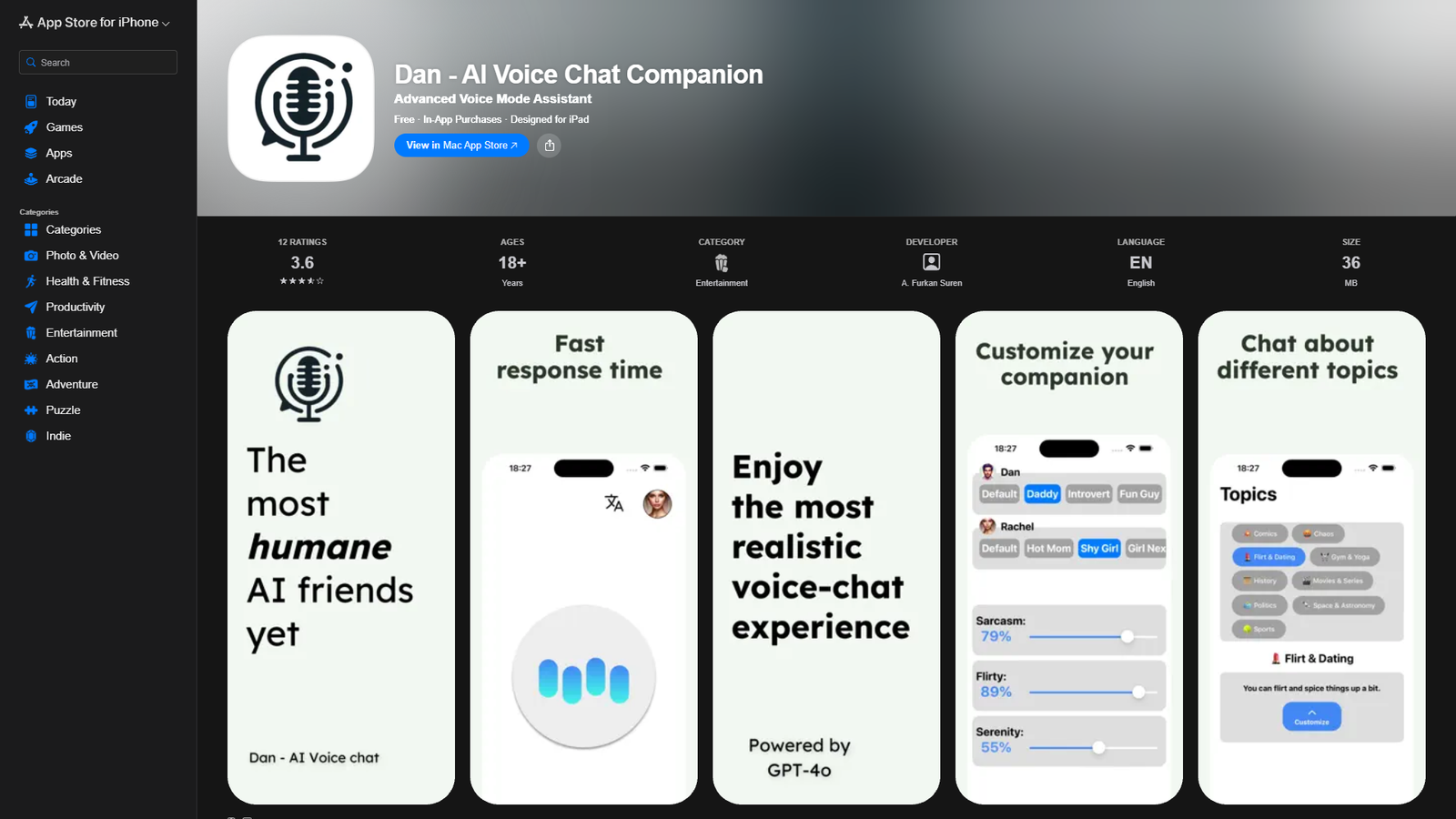 Категория Entertainment подчёркивает, что Dan отлично подходит для расслабленных бесед, тренировки английского, обсуждения хобби или поиска идей. Приложение бесплатно, с внутриигровыми покупками, и занимает минимум места на устройстве, оставаясь при этом мощным голосовым компаньоном на каждый день.