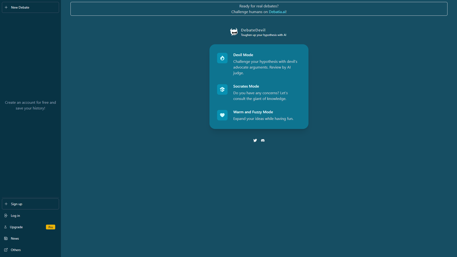 DebateDevil — чат-сервис для дискуссий с ИИ, который специально ищет контраргументы и помогает «закалить» вашу гипотезу. Вместо согласия по умолчанию вы получаете позицию «адвоката дьявола», чтобы увидеть слабые места идеи и приблизиться к более объективному взгляду.