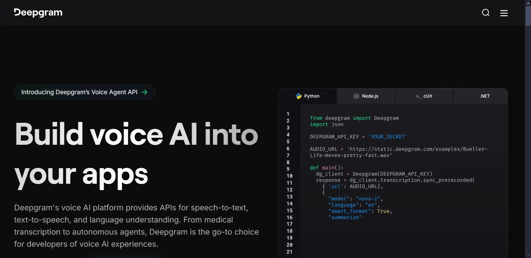 Deepgram – искусственный интеллект для преобразования речи в текст, анализа аудиоданных и создания голосовых интерфейсов. Технология использует глубокое обучение и адаптируемые языковые модели для обеспечения высокой точности и скорости обработки данных. Основное применение нейросети – интеграция голосовых возможностей в приложения через API deepgram, а также создание интеллектуальных решений для автоматизации работы с аудио.