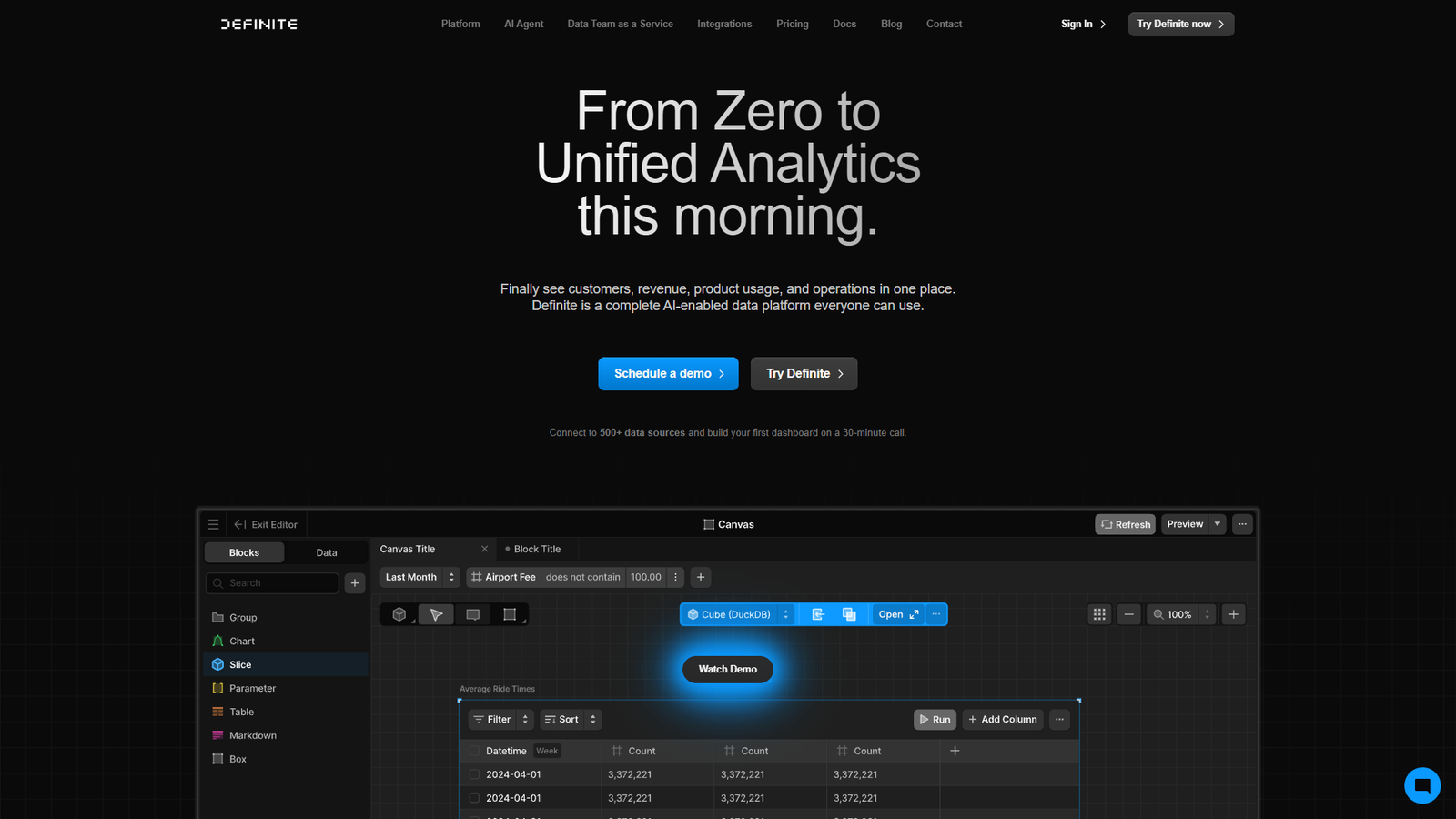 Definite — это единая AI-платформа для аналитики данных, которая позволяет собирать, хранить, анализировать и использовать данные в одном приложении. Сервис объединяет информацию о клиентах, выручке, продуктовой аналитике и операционных процессах, чтобы вы наконец увидели целостную картину бизнеса.