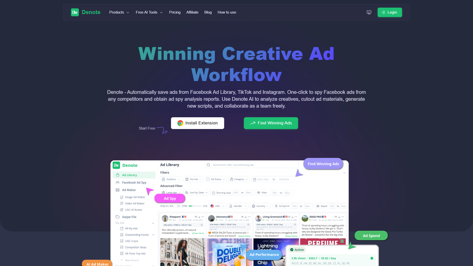 Denote — это инструмент для маркетологов и креативных команд, который автоматизирует работу с рекламными объявлениями из Facebook Ad Library, TikTok и Instagram. Сервис помогает находить, сохранять и анализировать лучшие креативы конкурентов в пару кликов.
