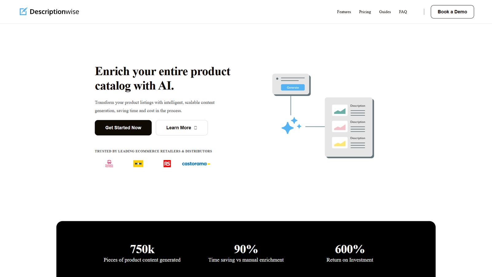 Descriptionwise автоматизирует наполнение товарного каталога для интернет-магазинов и дистрибьюторов. Нейросеть генерирует описания, характеристики и другие текстовые поля для карточек товаров, учитывая SEO-требования и структуру данных.