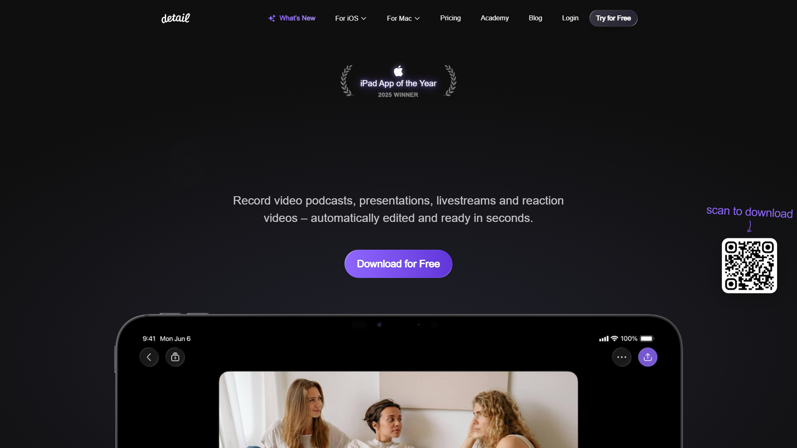 Detail подойдёт блогерам, подкастерам, экспертам и командам, которые регулярно записывают видео. Приложение отмечено наградой «iPad App of the Year 2025», что подтверждает удобство интерфейса и качество пользовательского опыта.