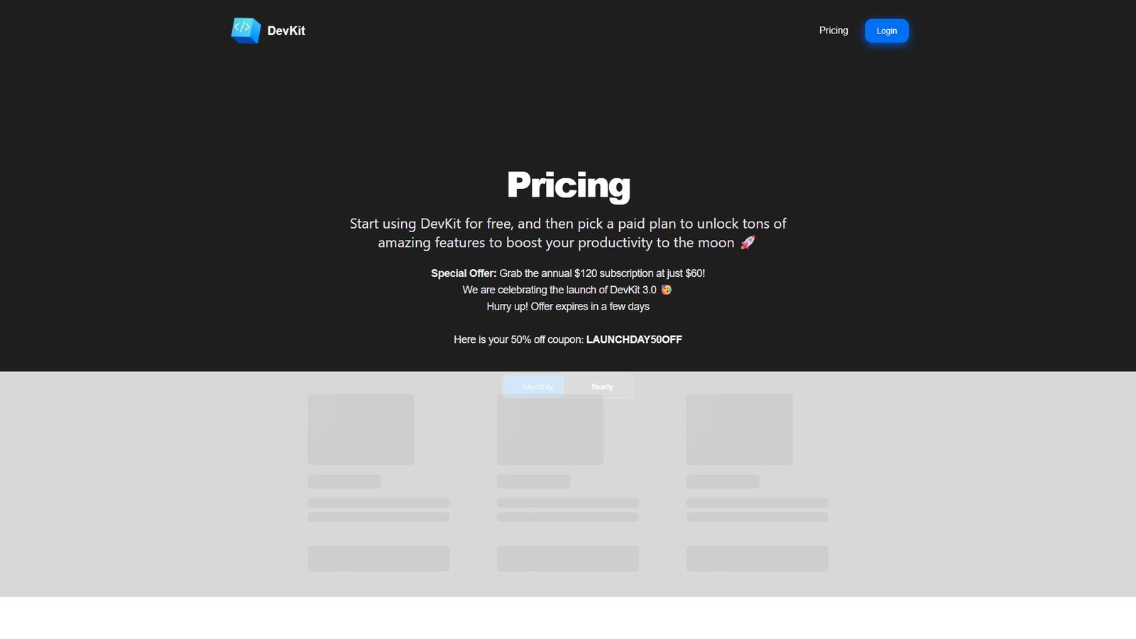 Сервис предлагает бесплатный старт: вы можете начать пользоваться DevKit без оплаты, а затем перейти на платный тариф, чтобы разблокировать расширенные функции и повысить продуктивность. На странице тарифов регулярно появляются специальные предложения, например 50% скидка на годовую подписку в честь релизов новых версий.