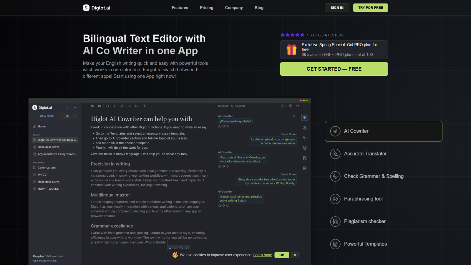 Diglot — двуязычный текстовый редактор с ИИ, заточенный под письмо на английском. Он объединяет в одном окне соавтора на базе нейросети, переводчик, проверку грамматики и орфографии, перефразирование и проверку на плагиат.