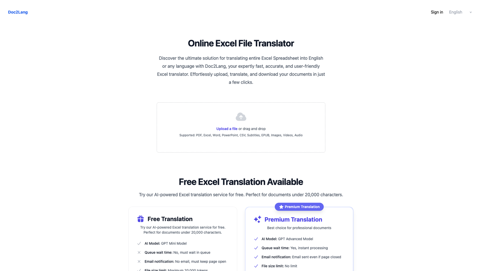 Doc2Lang Excel Translator автоматизирует перевод таблиц Excel и других документов с помощью ИИ. Достаточно загрузить файл, выбрать язык и дождаться готового перевода в исходной структуре.