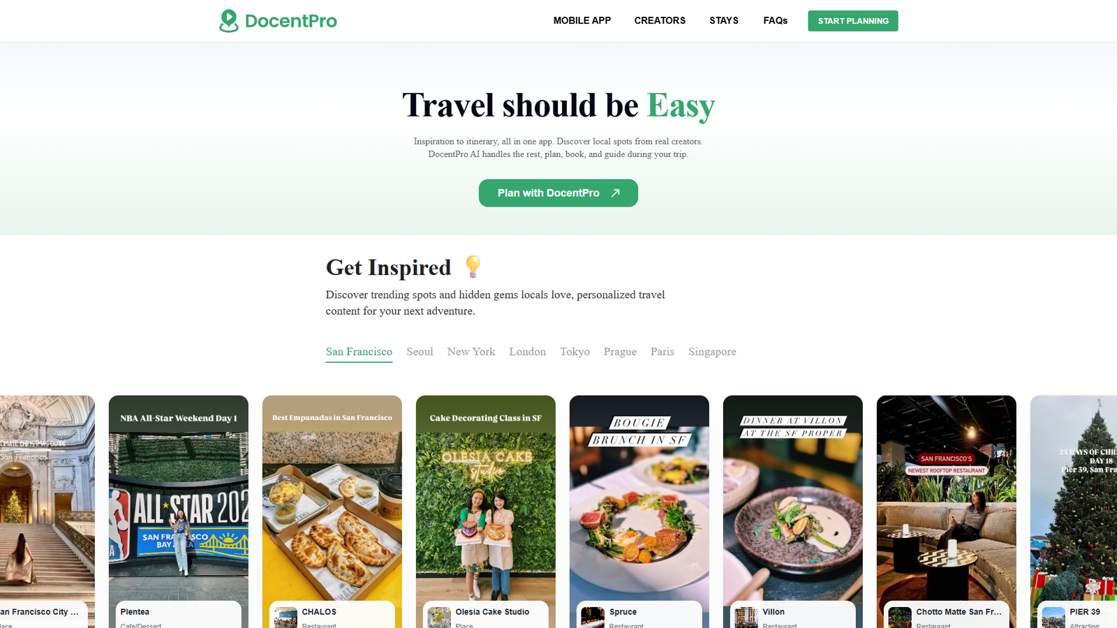 DocentPro — это умный AI-планировщик путешествий, который помогает спланировать поездку от идеи до возвращения домой. Сервис за секунды создает персонализированный маршрут, подбирает локации и активности под ваши интересы и формат отдыха.