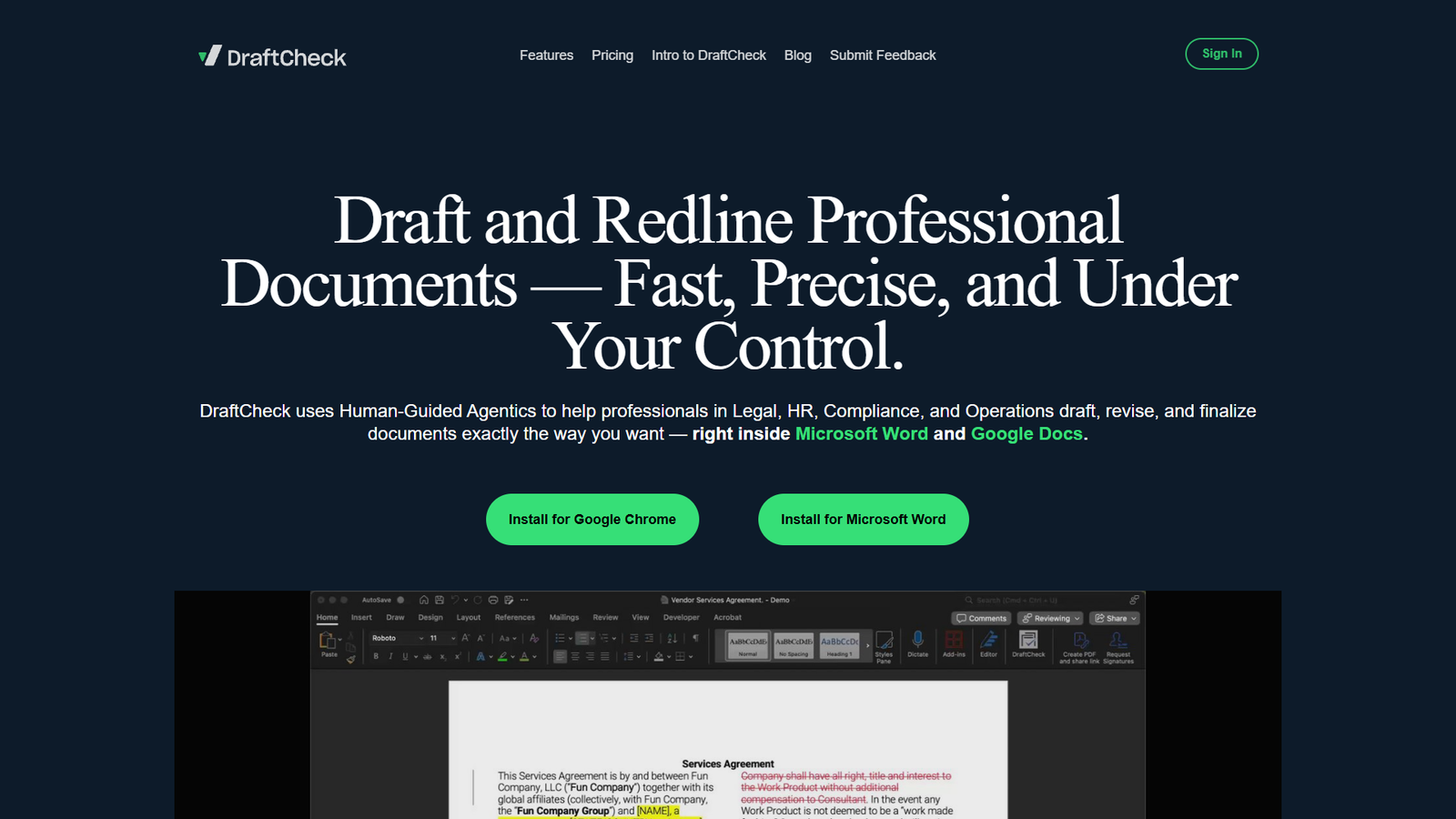 DraftCheck устанавливается как расширение для Google Chrome и надстройка для Microsoft Word, поэтому команда продолжает работать в привычных редакторах. Инструмент создан юристами и ориентирован на реальные сценарии: контракты, политики, соглашения, офферы и другие бизнес-документы.