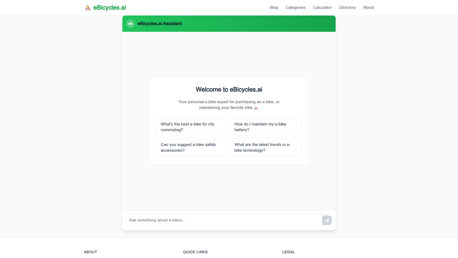 eBicycles.ai — это специализированный ИИ-ассистент для любителей и владельцев электровелосипедов. Сервис помогает выбрать подходящий e-bike под ваши задачи и условия езды, а также подсказывает, как правильно ухаживать за уже имеющимся велосипедом.