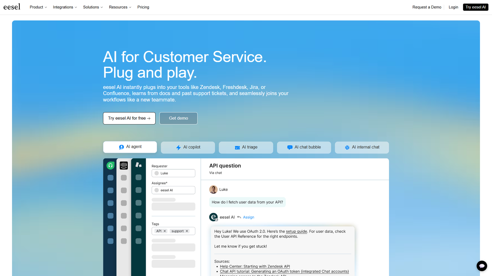 eesel AI интегрируется с Zendesk, Freshdesk, Jira, Confluence, Shopify, Google Docs и другими системами. Подключение занимает несколько кликов: нейросеть получает доступ к статьям, тикетам и внутренним документам, чтобы строить ответы на реальных данных, а не на общих шаблонах.