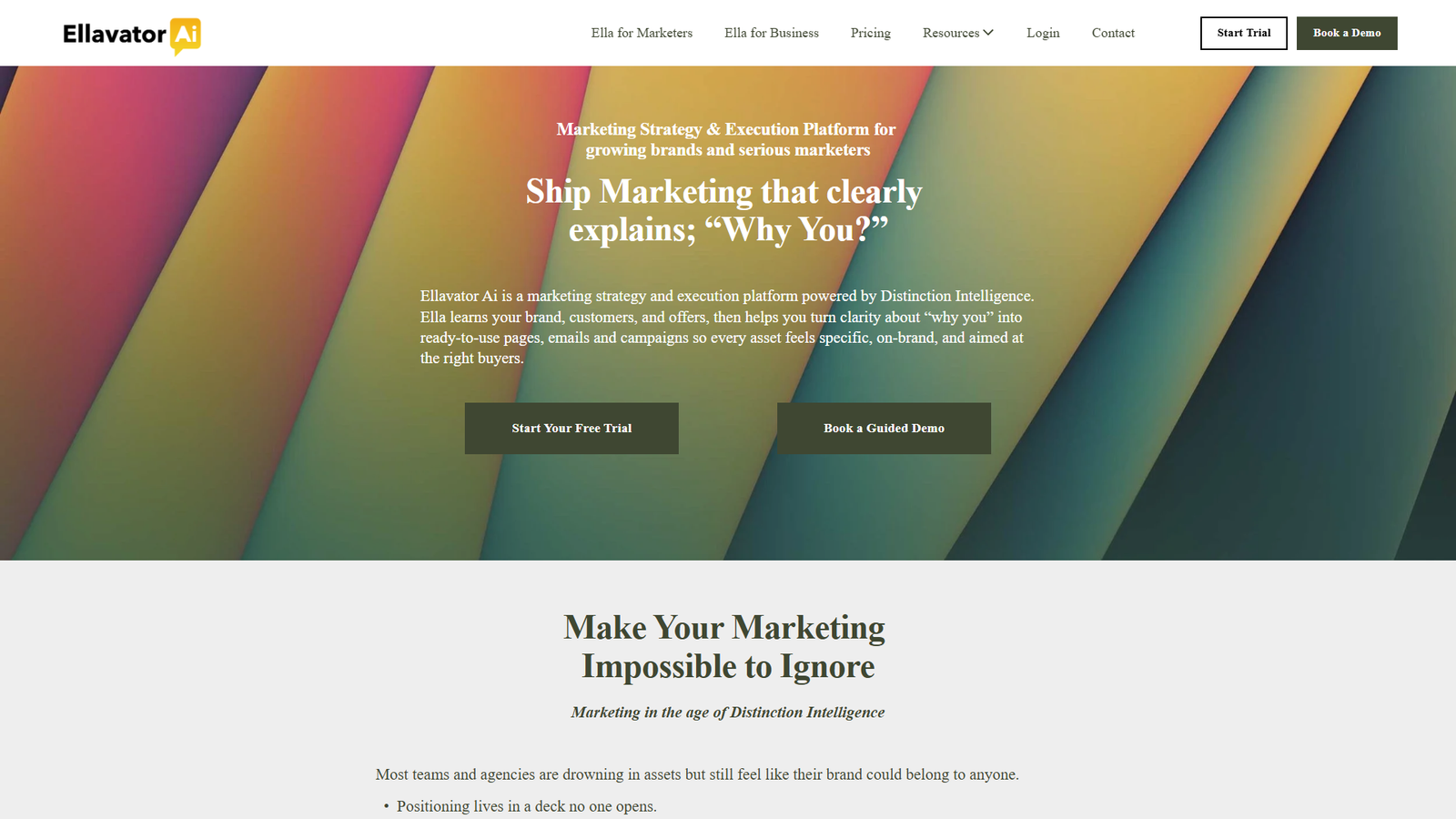 Ellavator AI — это платформа маркетинговой стратегии и исполнения, которая помогает брендам чётко ответить на главный вопрос клиентов: «Почему именно вы?». Сервис использует собственную Distinction Intelligence, чтобы глубоко понять ваш бренд, аудиторию и предложения.