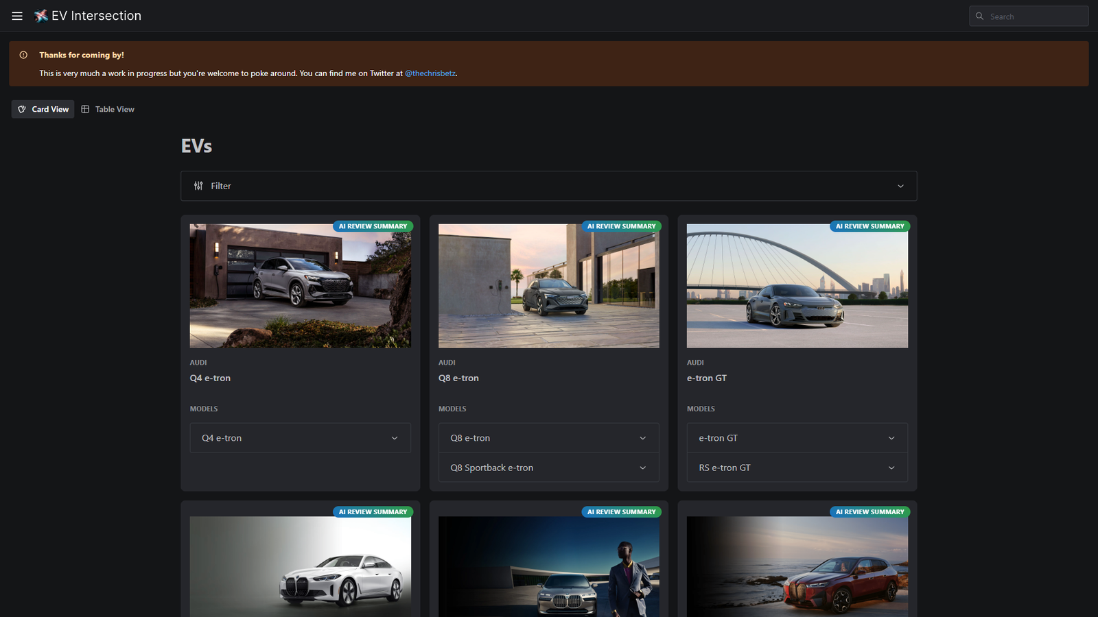EV Intersection — это онлайн-сервис для подбора и сравнения электромобилей с помощью ИИ. Платформа собирает информацию о популярных моделях EV и превращает разрозненные обзоры в понятные, сжатые AI-резюме.