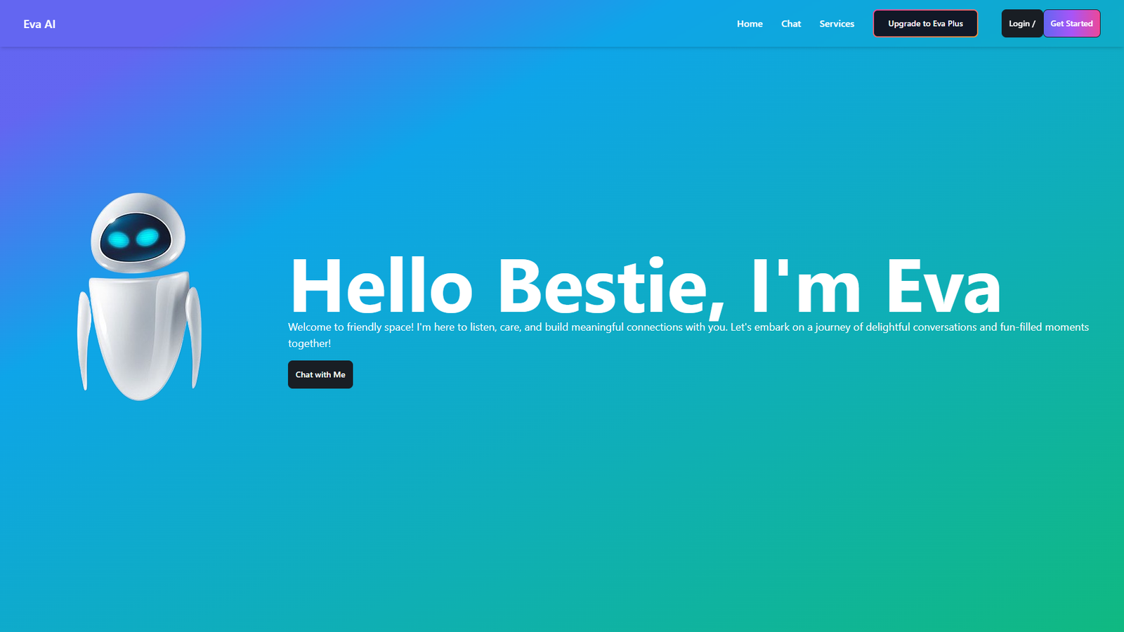 На главной странице доступен быстрый старт: достаточно нажать «Chat with Me» и перейти к диалогу. Для активных пользователей предусмотрено расширение функциональности через Eva Plus, а профиль помогает сохранять историю и возвращаться к важным разговорам.