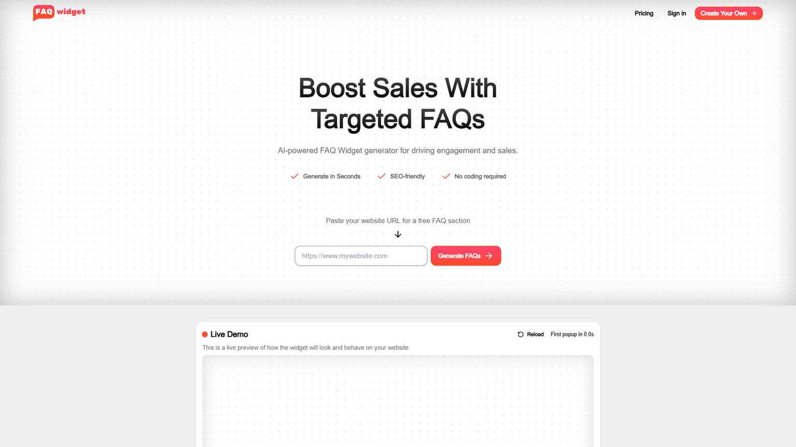 Сервис предлагает живой демо-просмотр: вы сразу видите, как FAQ-виджет будет выглядеть и вести себя на вашем сайте. Это позволяет протестировать решение и оценить эффект до того, как вы примете окончательное решение.