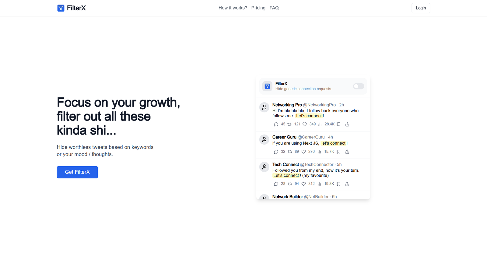 FilterX нацелен на борьбу с типичными «давай коннектиться» постами, массовыми призывами подписаться и другими шаблонными сообщениями. Такие твиты не удаляются из X, но перестают отвлекать в интерфейсе FilterX, чтобы внимание уходило на действительно важные темы.
