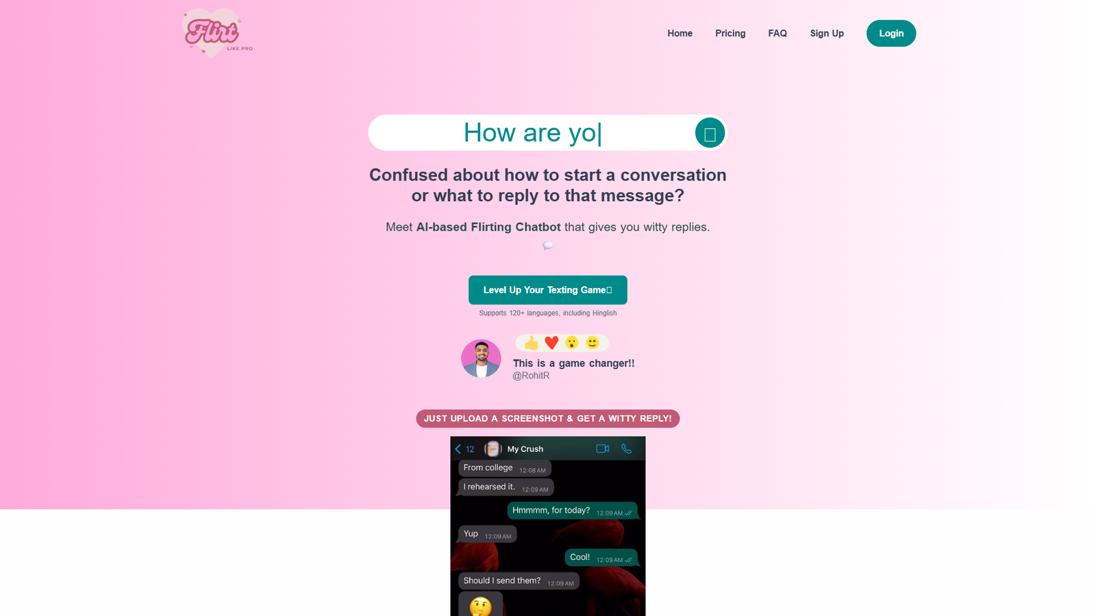 Flirt Like Pro — это AI-чатбот для флирта и переписки, который подбирает остроумные ответы за секунды. Он помогает начать разговор, поддержать диалог и избежать неловких пауз в мессенджерах и на дейтинговых платформах.
