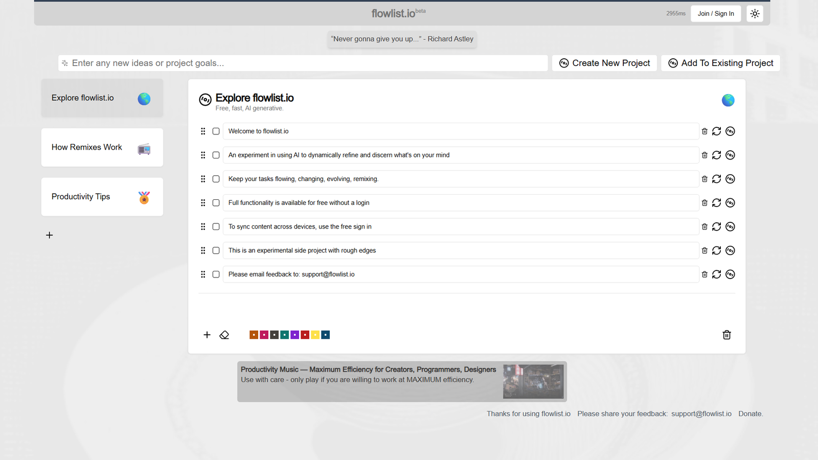 flowlist.io работает прямо в браузере: достаточно зарегистрироваться и начать планировать. Интерфейс минималистичный, без перегрузки функциями, а ИИ‑слой незаметно помогает вам оставаться организованным и мотивированным в течение дня.