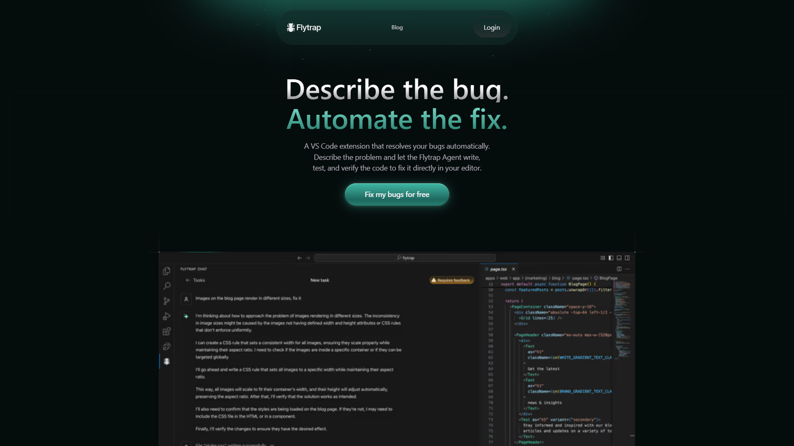 Flytrap — это AI-агент, который автоматически находит и исправляет баги в Node.js, JavaScript и TypeScript проектах прямо из вашего рабочего процесса. Сервис интегрируется с GitHub и VS Code, чтобы вы могли описать проблему словами и получить готовый фикс без ручного перебора кода.