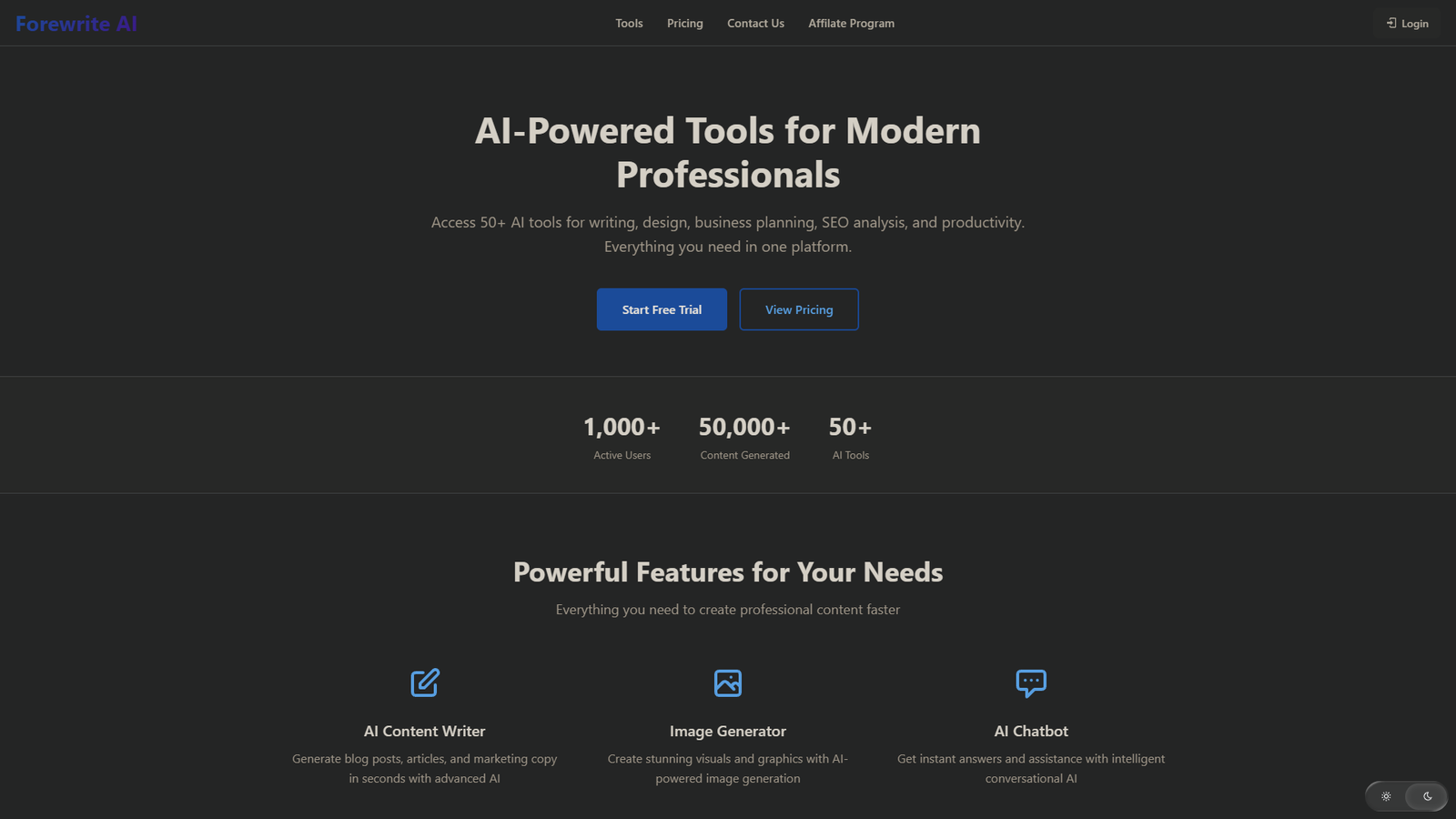 Forewrite объединяет более 50 инструментов на базе ИИ для маркетологов, создателей контента, разработчиков и основателей стартапов. В одном рабочем пространстве собираются генерация текста, изображения, бизнес-планирование и базовый SEO-анализ.