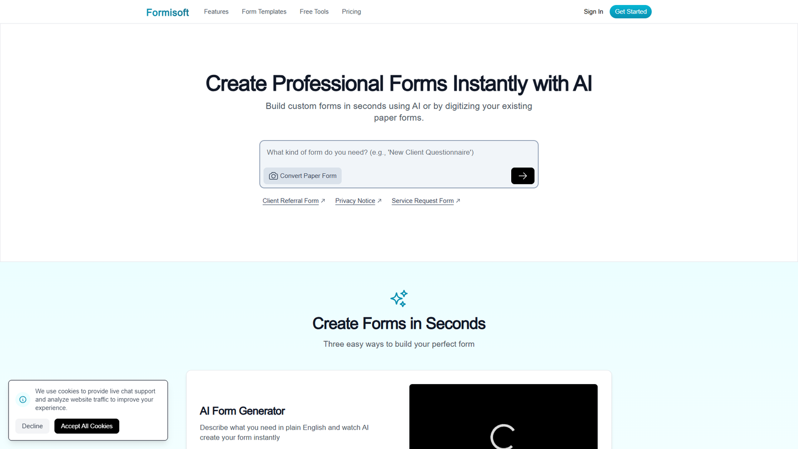 Formisoft — это онлайн‑сервис на базе ИИ для мгновенного создания профессиональных форм: анкет клиентов, пациентских опросников, форм запросов услуг и многого другого. Платформа помогает бизнесам и клиникам быстро оцифровывать бумажные бланки и переводить весь процесс сбора данных в удобный цифровой формат.