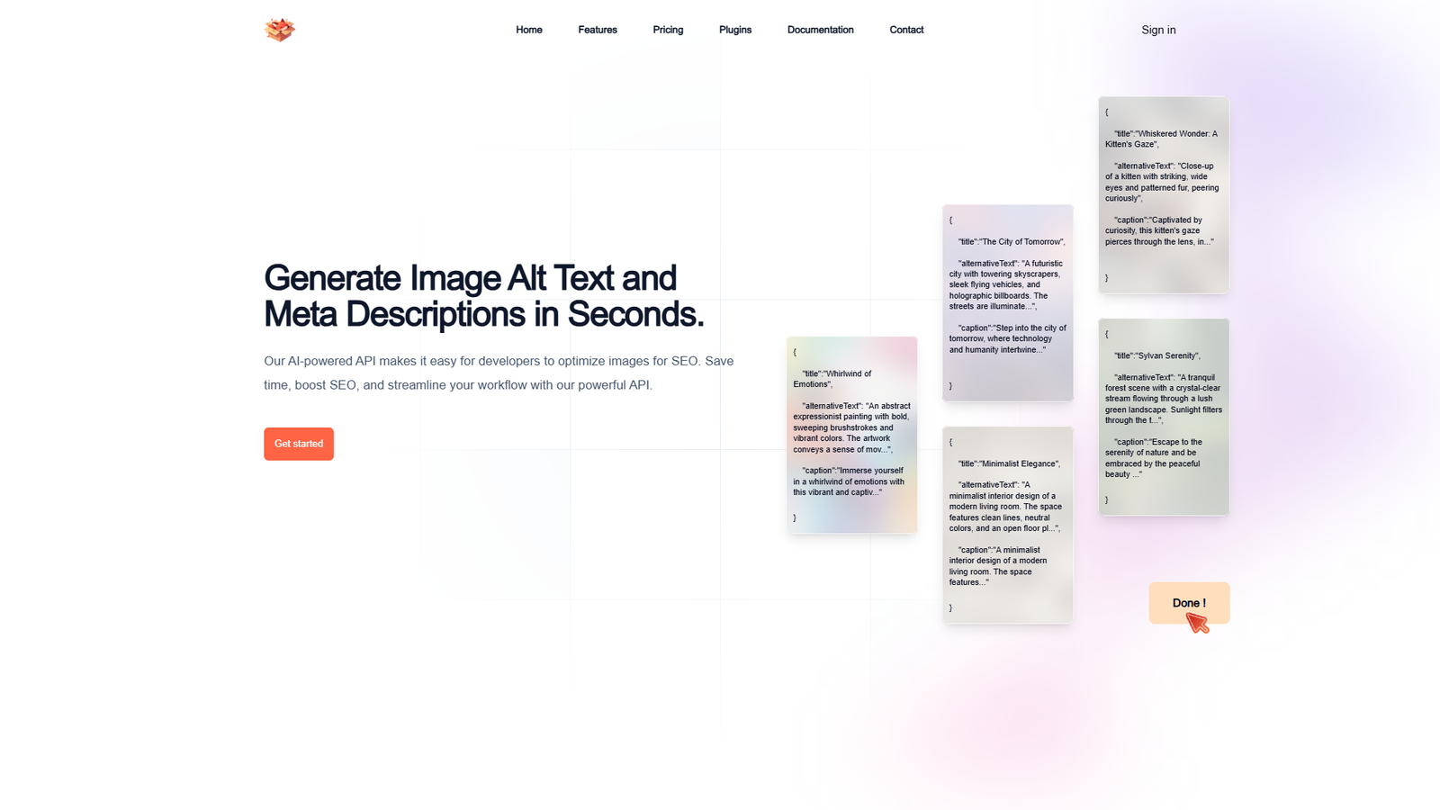 Пользователь загружает изображение или отправляет его через API и получает структурированный ответ: title, alt-текст и caption. Описания учитывают содержание кадра, стиль и контекст, что особенно важно для интернет-магазинов, блогов и медиа-проектов с большим количеством графики.