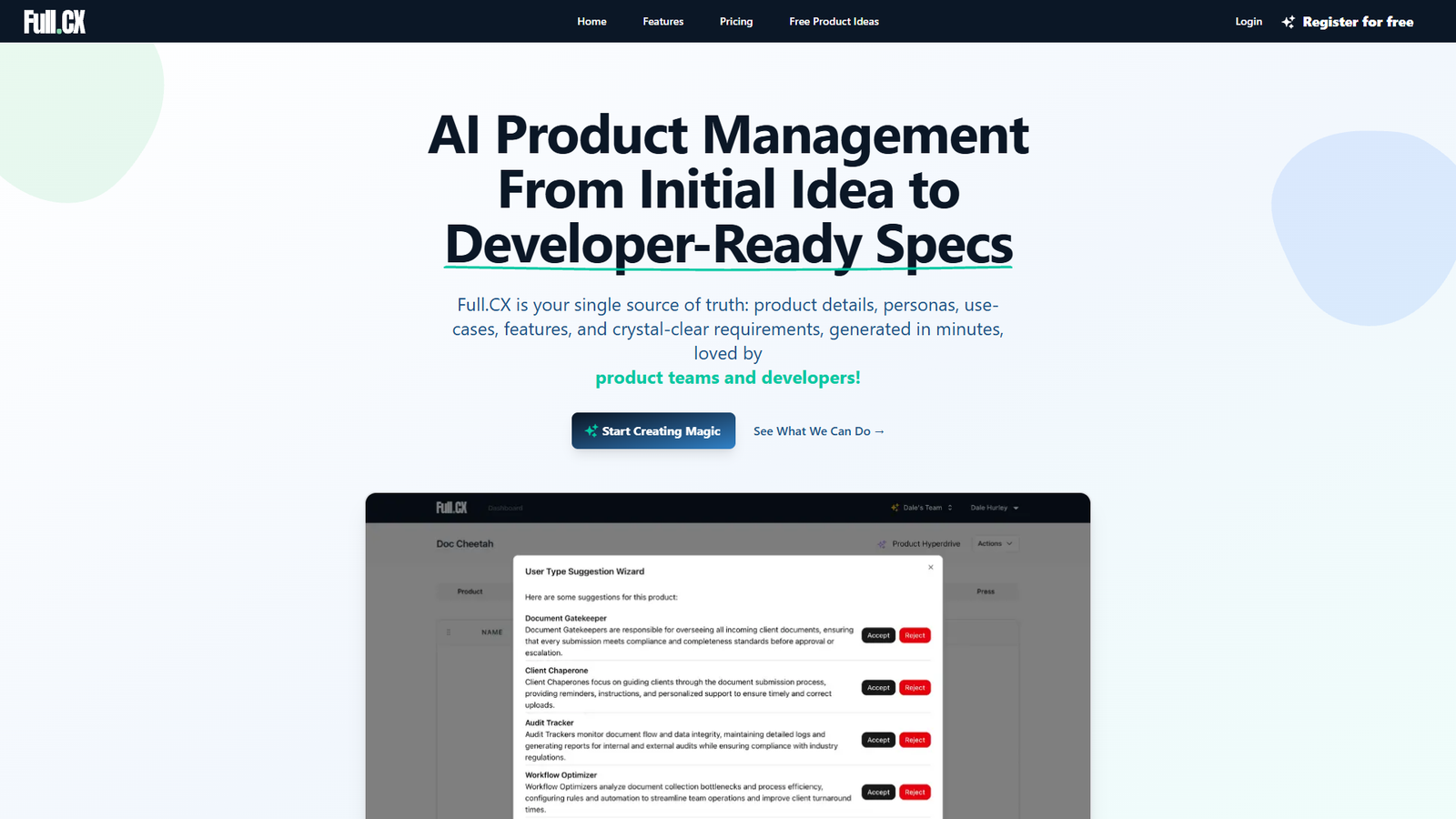 Full.CX фокусируется на одной задаче: превратить размытые продуктовые идеи в понятные для разработчиков спецификации. В одном рабочем пространстве собираются детали продукта, персоны, сценарии использования и функции, а затем на их основе формируются структурированные требования.