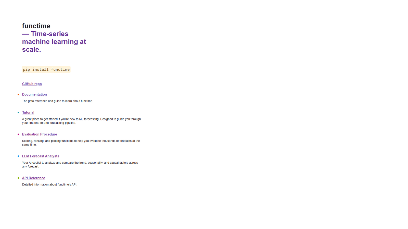 Сервис предлагает понятный вход через установку pip install functime, а также подробную документацию и туториал, который проводит через полный пайплайн прогнозирования — от подготовки данных до получения и сравнения результатов.