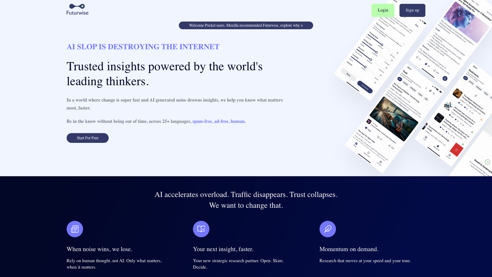 Futurwise — сеть коллективных инсайтов, которая помогает отфильтровать шум и сосредоточиться на действительно важных идеях. Вместо бесконечной ленты случайных материалов пользователь получает доступ к отобранным мыслям ведущих мыслителей и экспертов.