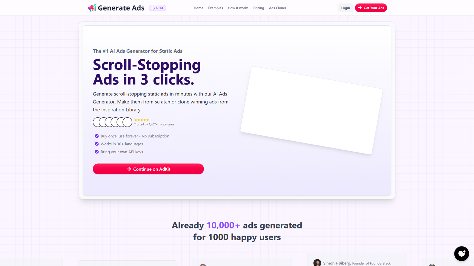 Generate Ads AI — инструмент для быстрой генерации статичных рекламных креативов с помощью ИИ. Он ориентирован на маркетологов, владельцев бизнеса и агентства, которым нужно много объявлений под разные продукты и языки.