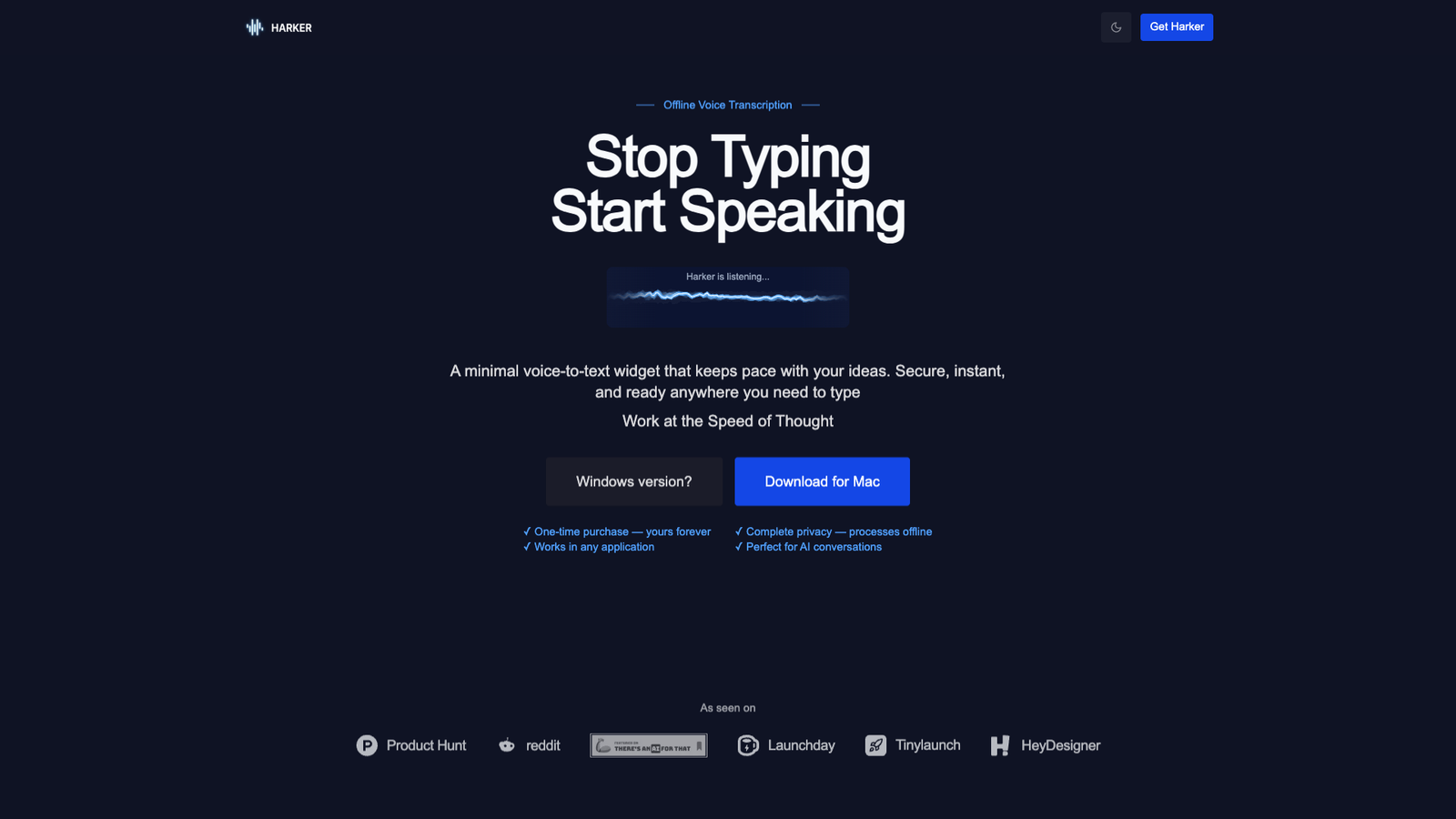 Harker — это минималистичный виджет голосового ввода, который превращает речь в текст прямо на вашем компьютере. Он работает офлайн, поэтому все данные остаются на устройстве, без отправки в облако и сторонние сервисы.