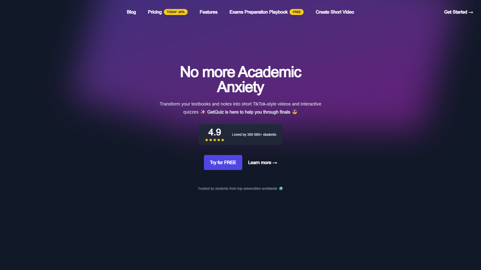 GetQuiz — это ИИ-сервис, который превращает ваши конспекты, учебники и презентации в короткие TikTok‑подобные видео и интерактивные квизы. Вместо скучного перечитывания материалов вы получаете динамичный формат обучения, который помогает лучше запоминать и меньше переживать перед экзаменами.