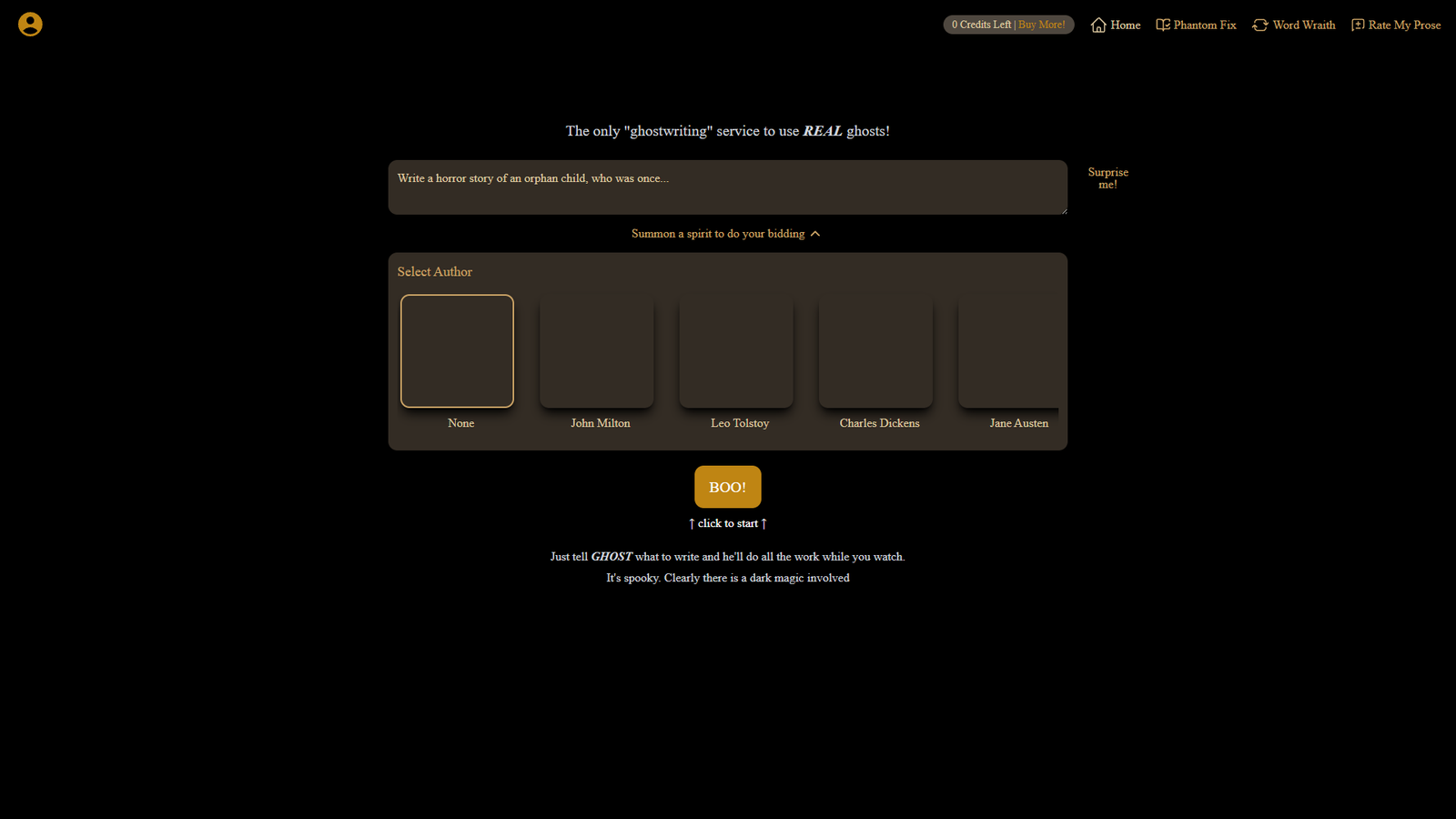 Ghost The Writer — необычный онлайн-сервис «призрачного» копирайтинга, который стилизует тексты под культовых авторов прошлого. Вы выбираете писателя, а «призрак» берёт на себя всю творческую работу, создавая текст в узнаваемой манере выбранного классика.