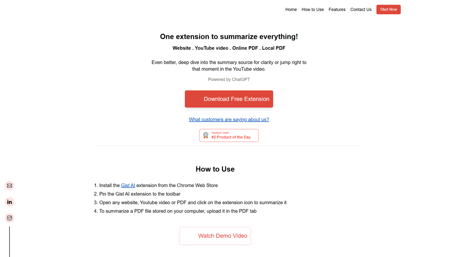 Gist AI — это бесплатное расширение для Chrome, которое автоматически кратко пересказывает любой онлайн‑контент: веб‑страницы, ролики YouTube и PDF‑файлы. Сервис работает на базе ChatGPT и помогает быстро вытащить главное из длинных текстов и видео.