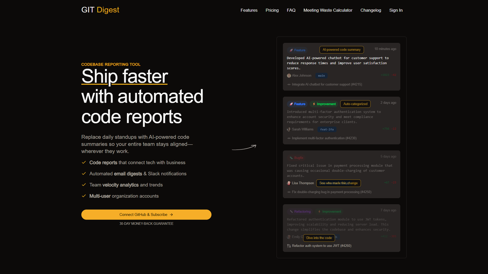 Сервис подключается к GitHub и формирует понятные дайджесты: какие фичи реализованы, что было изменено, как это влияет на продукт и бизнес. Вместо ручных сводок вы получаете структурированные email-отчёты и уведомления в Slack.