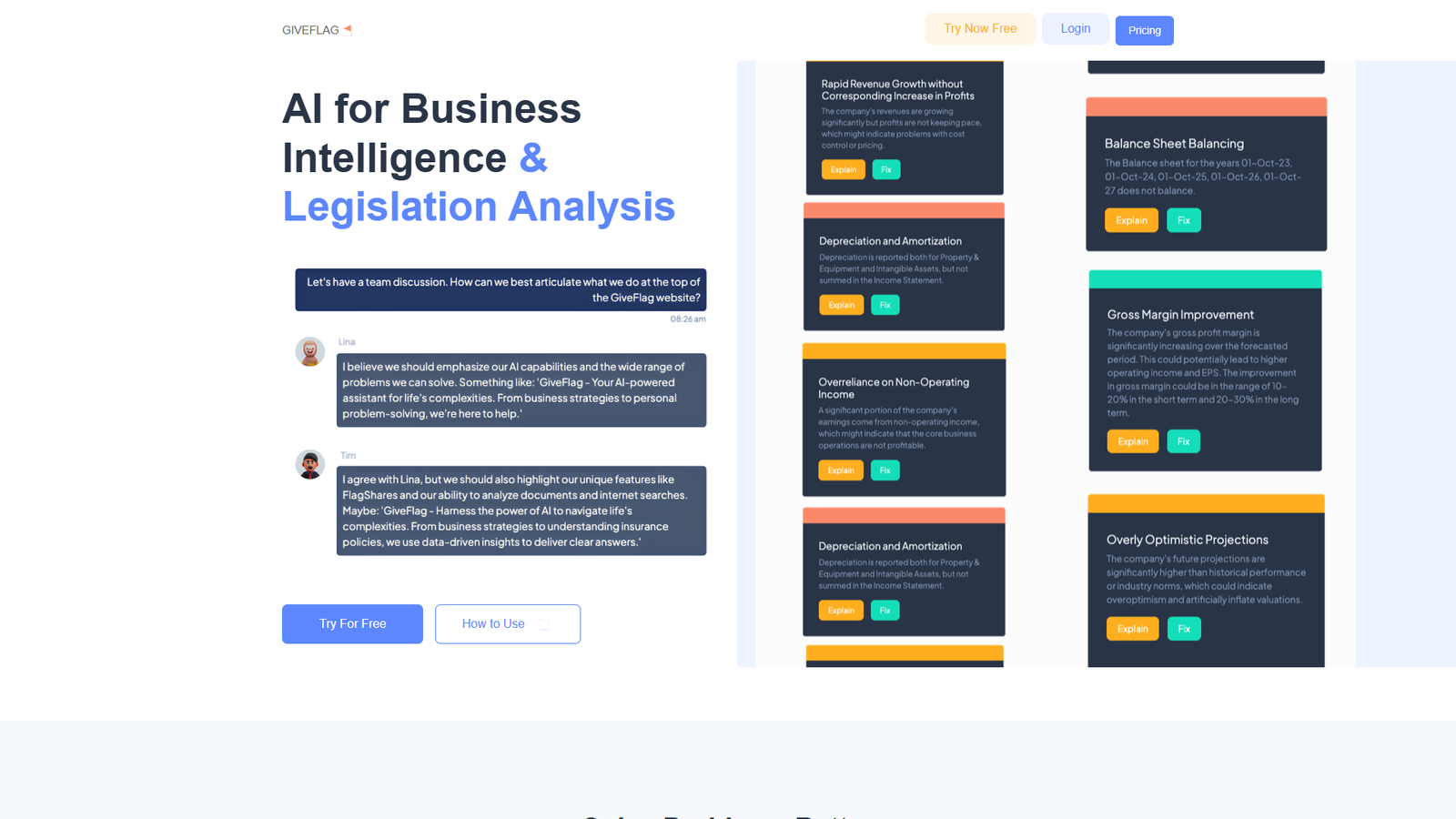GiveFlag — это команда ИИ-персон, которая помогает принимать более взвешенные решения в бизнесе и личных проектах. Сервис фокусируется на сложных документах и аналитике: от форм 10-K и сделок M&A до бизнес-планов, политик конфиденциальности и страховых договоров.